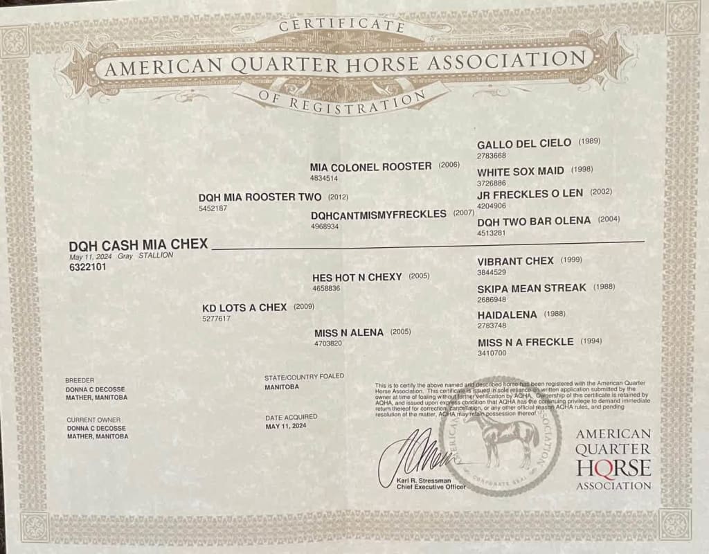 Take a look at this big fancy fellow. He is a big stout colt with lots of eye appeal His sire DQH Mia Rooster Two aka Jagger is a money earner himself and his offspring have been following in his footsteps in the rodeo arenas, tie down roping, break away and team roping across the country and into the US. His latest being DQH Cielo Dell Rio being voted the Mb High School Rodeo Horse of the Year for 2024. His Dam comes from the Mile 77 Quarter Horses program and has been an excellent producer for us. She traces back to Nu Chex To Cash, Miss N Cash and Haida Little Pep to name a few. This mare was our high selling foal last year crossed on Cooper our Frenchman's Guy bred stallion and this cross is looking to be just as good. This colt is built to last and he is sure going to look fancy doing what ever task you set him to We are members of the up and coming Legends of the Prairie Rope and Barrel Racing Futurity and all of our foals are eligible to be nominated into the program. Contact Donna @ 204-529-2515 or 204-245-0655 Visit our website: https://decossequarterhorses.com/