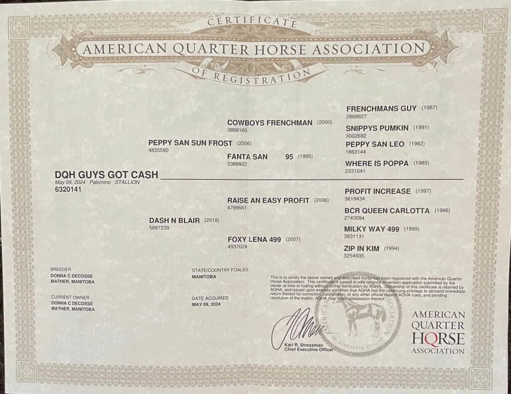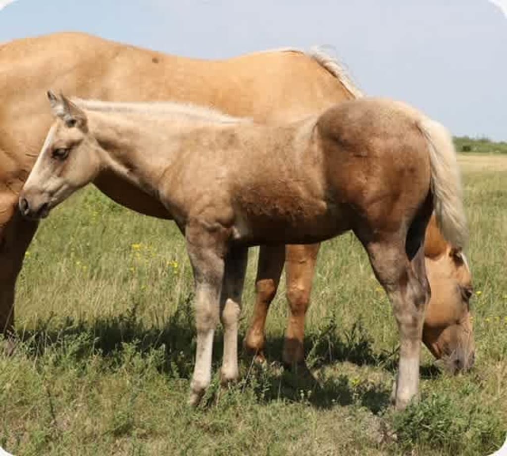 We purchased this mare from Laurie Lehne in 2020 to bring a shot of speed to the table to cross on our Peppy San Sun Frost aka Cooper stallion. Her first foal for us sold privately so this will be the first time bringing one of her foals to be presented to the public. Take a look at this big shapey palomino colt The Cooper babies have been doing well in the barrel pen as well as all round family and ranch horses. This colt should have the speed, good bone and size to excel in what ever direction you want to take him We are members of the up and coming Legends of the Prairie Rope and Barrel Racing program Futurity and all of our foals are eligible to be nominated into the program Contact Donna @ 204-529-2515 or 204-245-0655. Visit our website: https://decossequarterhorses.com/