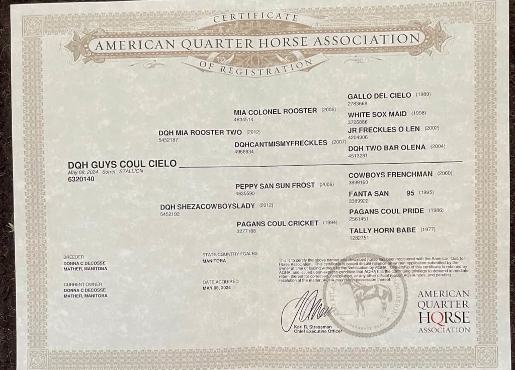 Here is a nice solid colt who is ready to take you any direction you want. He's an "In your pocket" type who loves attention. He has a calm curious mind that should transition well into training. His sire DQH Mia Rooster Two aka Jagger is a money earner himself and his offspring have been following in his footsteps in the rodeo arenas, tie down roping, break away and team roping across the country and into the US. His latest being DQH Cielo Dell Rio being voted the Mb High School Rodeo Horse of the Year for 2024. His Dam is a daughter of our Peppy San Sun Frost stallion. She goes back to some old time run on her bottom side. We are loving this cross and are getting rave reviews from past owners Contact Donna @ 204-529-2515 or 204-245-0655. Visit our website:https://decossequarterhorses.com/
