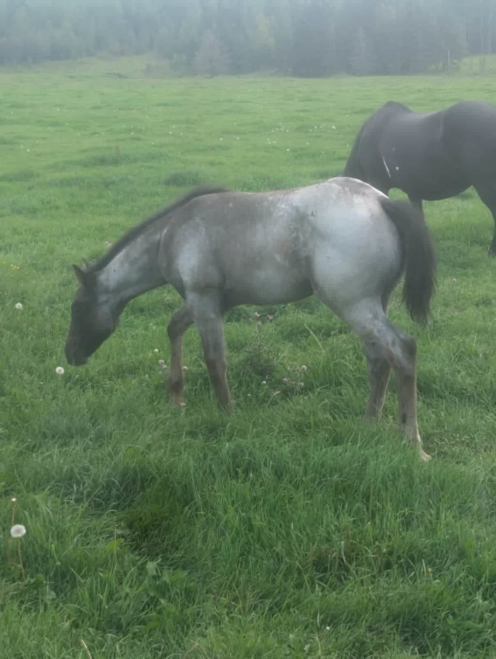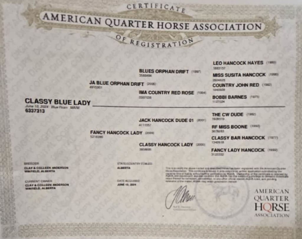 This filly is as Hancock as you can make one. She is very correct and very gentle. She will get noticed every where she goes. She is a true blue roan and will stay blue her whole life. Come take a look.
