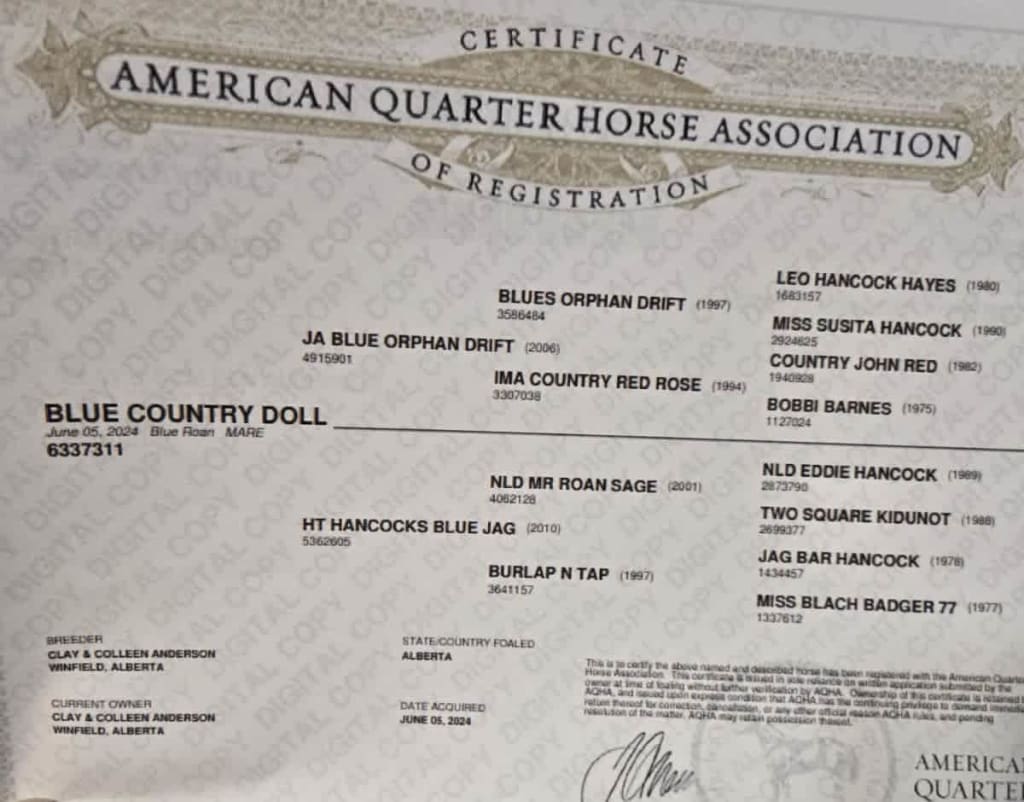 Here is that ranch mare that you have been looking for, big solid blue filly. She will be very stout when mature. She will be that go to ranch horse that is so sot after. Call Clay for more info. 780-898-8406.