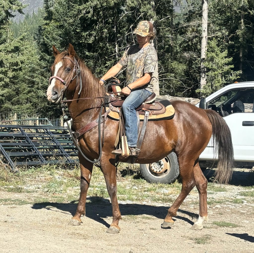 Stormy is a grade QH mare. Was used as a lesson horse ten years ago. Has been rode lots by green riders and does well. She has had the last 2 years off. Needs to have a job. We have too many young ones to keep her busy.