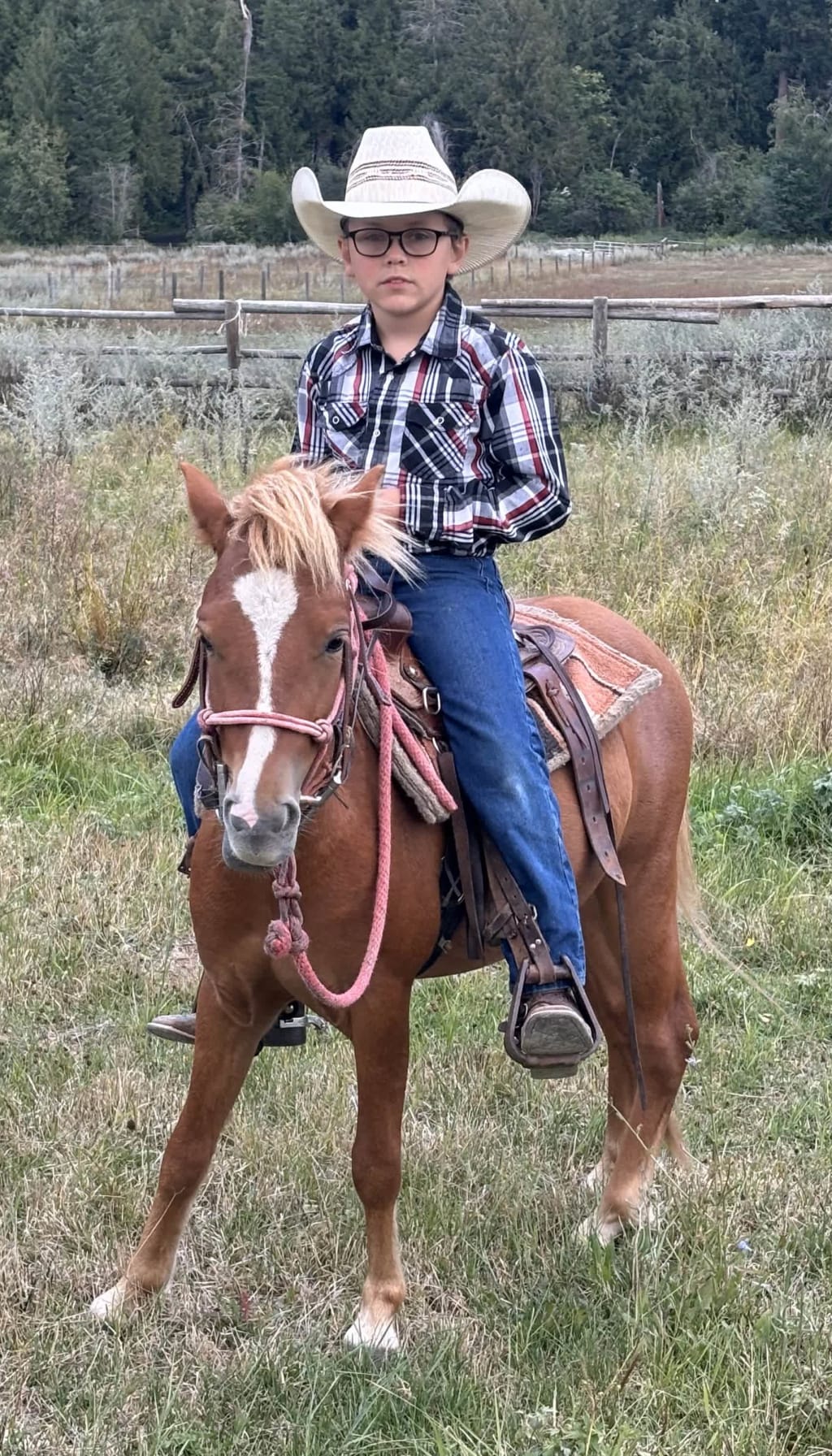 Chip is a 3 year old pony. Has been rode on many trail rides into the mountains. He has also chased cows in the arena. He has a really good start and is ready for his next little cowboy.