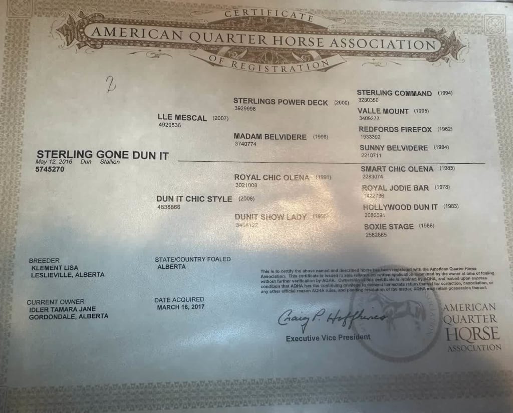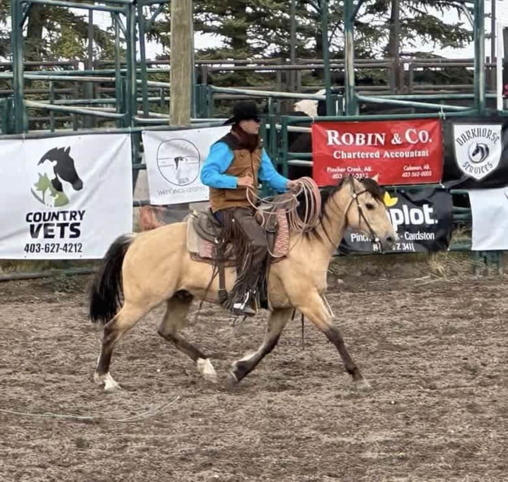 Sterling is 8 years old, stands 14.3hh with solid bone and feet. He has done every job around the ranch and feedlot. Has doctored lots of cattle and tied off. Sterling has been to ranch rodeos and brandings. Good to load, catch, tie and shoe. Any questions call Ed 403-895-8522.