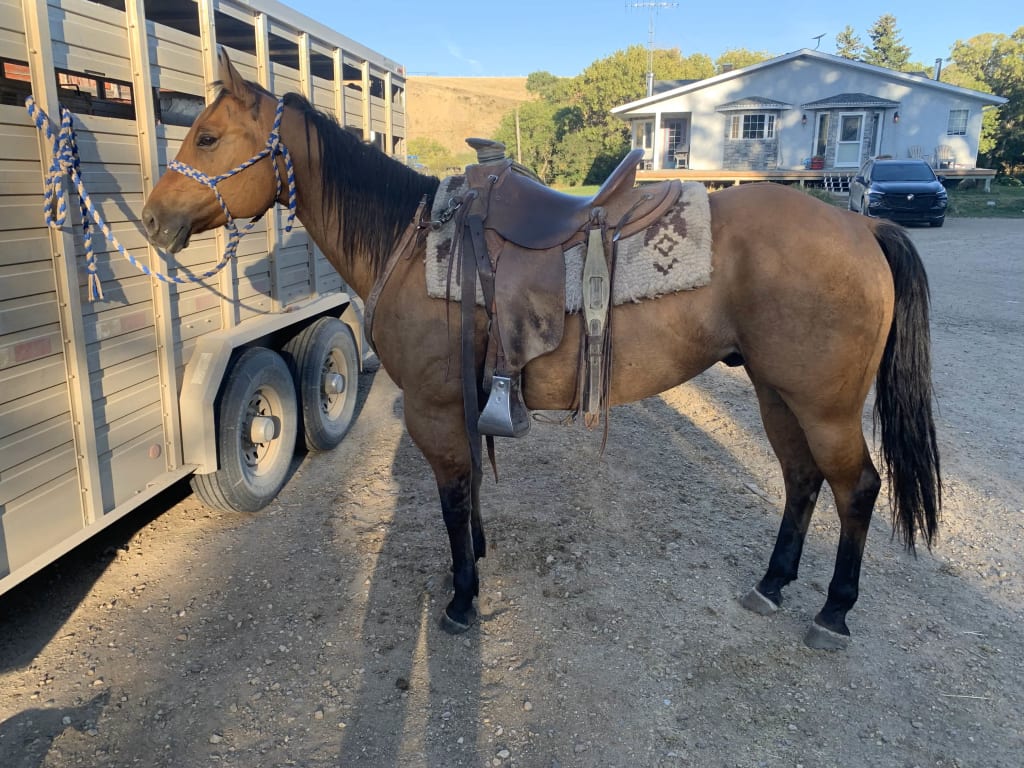 Doc is a 5 year old Dun Gelding he is gentle with a kind eye. He's done everything on the ranch, he's sorted, trail cows, pasture roped and has worked colts in the round pen. He's easy to get along with and is a very nice mover has good black feet and is willing to do what you ask. He has been ridden by Curtis Vossler all summer.