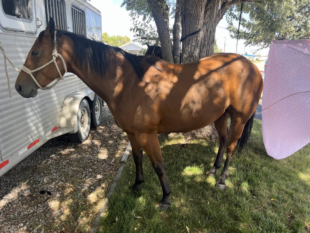 5 year old grade bay mare, 15.1HH, been out to check pasture, rope and doctor, sort. Good with her feet, quiet to be around and easy to catch.