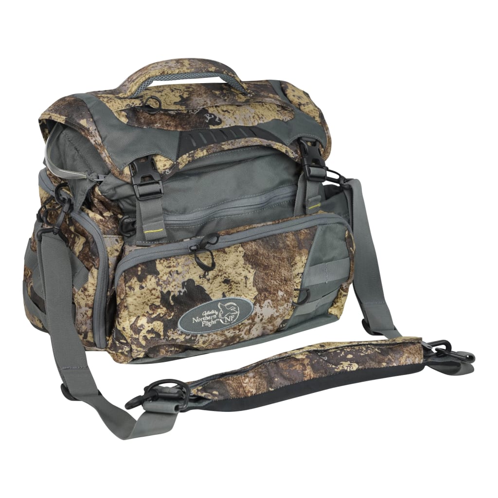 Make it easier to haul all your waterfowling gear to the blind and back with the Northern Flight™ Locked-Up Blind Bag. Made of a rugged 600D nylon with polyurethane backing for great water resistance, this durable blind bag also features a water-resistant CMEVA bottom for top-notch durability and protection. Removable fibreglass corner stakes add rigidity and structure. The double-buckle, full-coverage lid system with a zippered mesh pocket on the underside provides full access to the bag's large main compartment and mesh organization pockets. The bag's zippered flap sports 2 removable 4-loop duck straps for easily transporting downed ducks back to your vehicle. Divided side pockets keep gear separated and easy to access. Divided front zippered pocket has a key chain fob and zippered waterproof pouch for protecting your cell phone and electronics. Rubberized mesh-faced pocket with hook-and-loop closures carry your cased shotgun or extra clothing. Drawstring-close 3.8"x7" pocket is perfectly sized for your thermos. Heavy-duty sling shoulder strap for convenient carry to and from your truck.