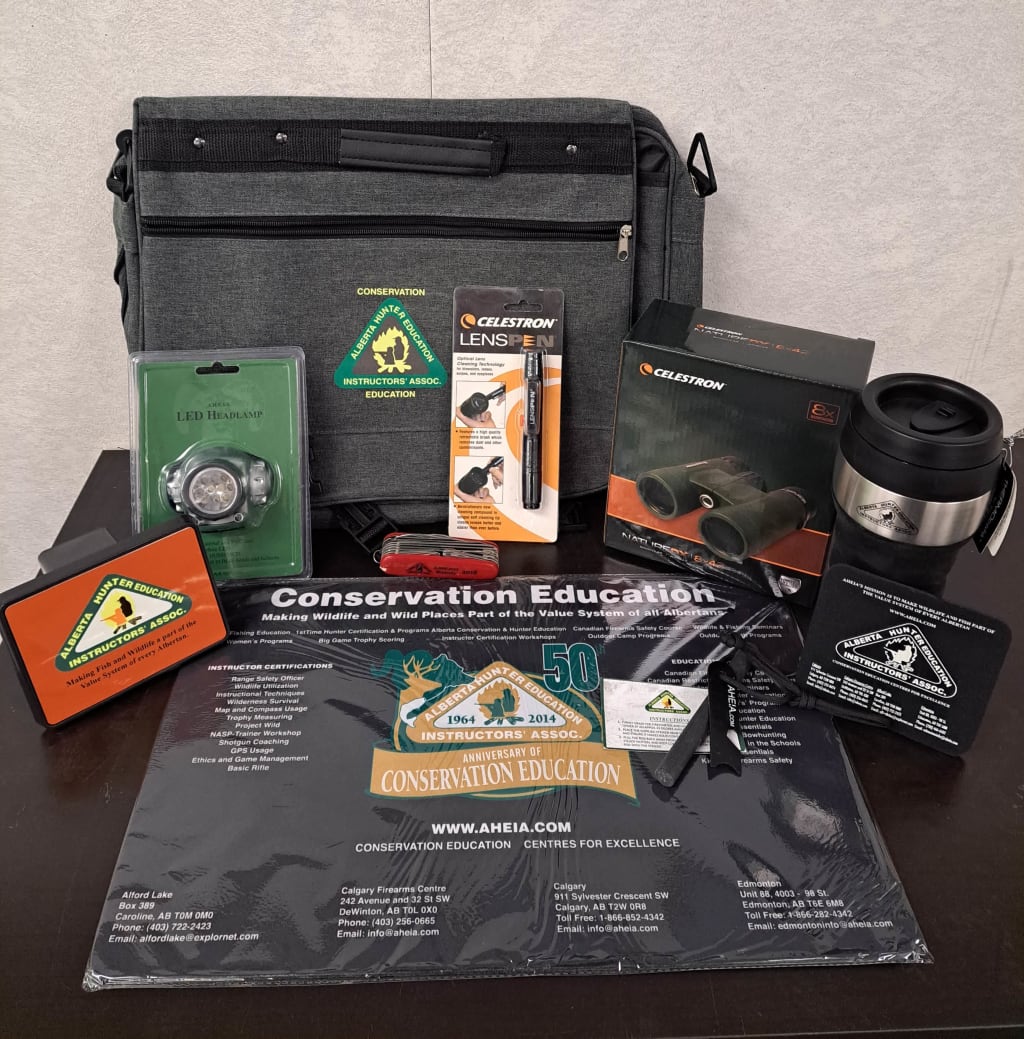 Celestron Nature 8x42 Binoculars, Lens pen, AHEIA handgun mat, bag, headlamp, flint & steel, thermos, hitch cover, coaster, and pocket knife