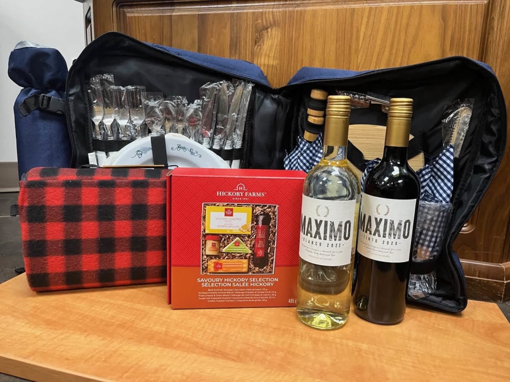 Picnic Bag set with Blanket, Maximo Red & White Wine and Hickory Farms box set