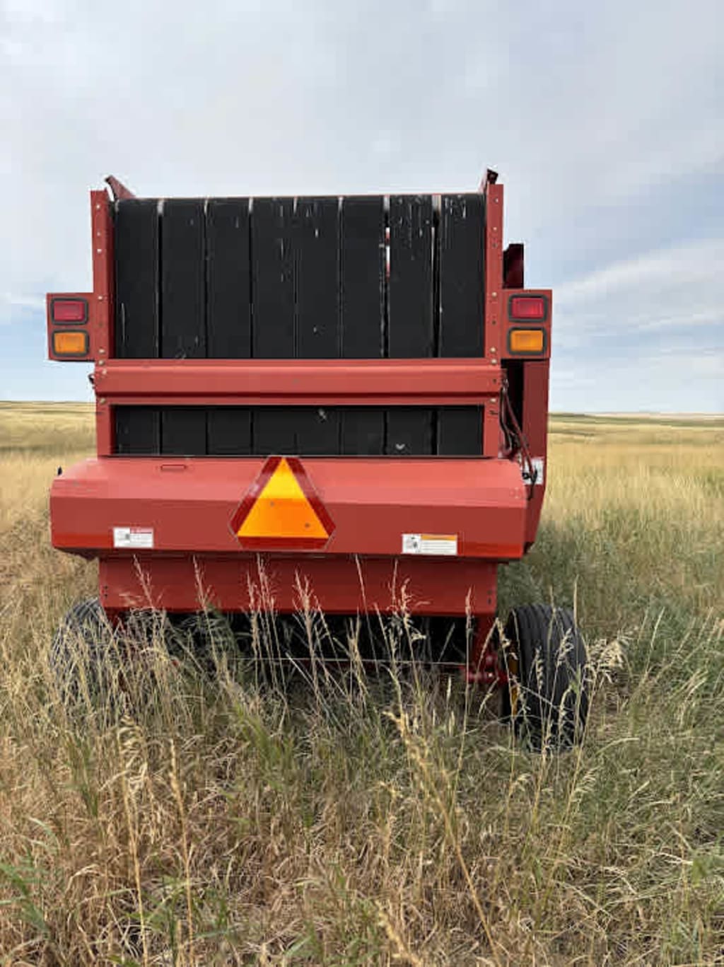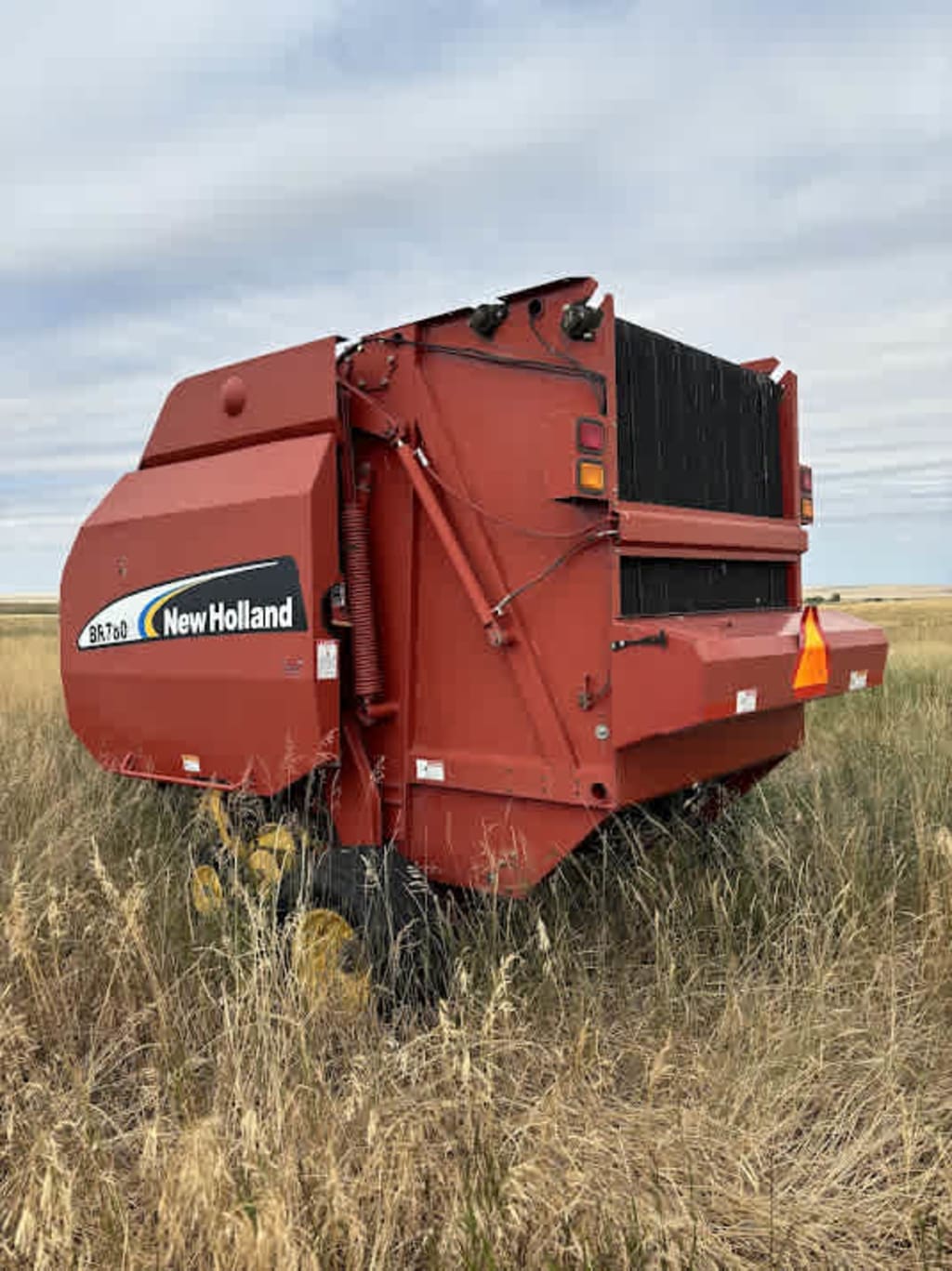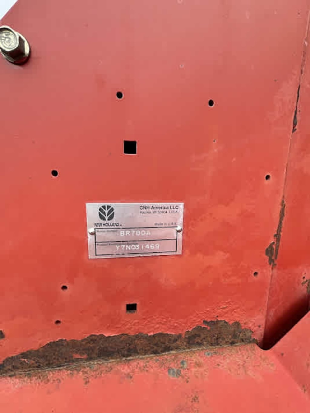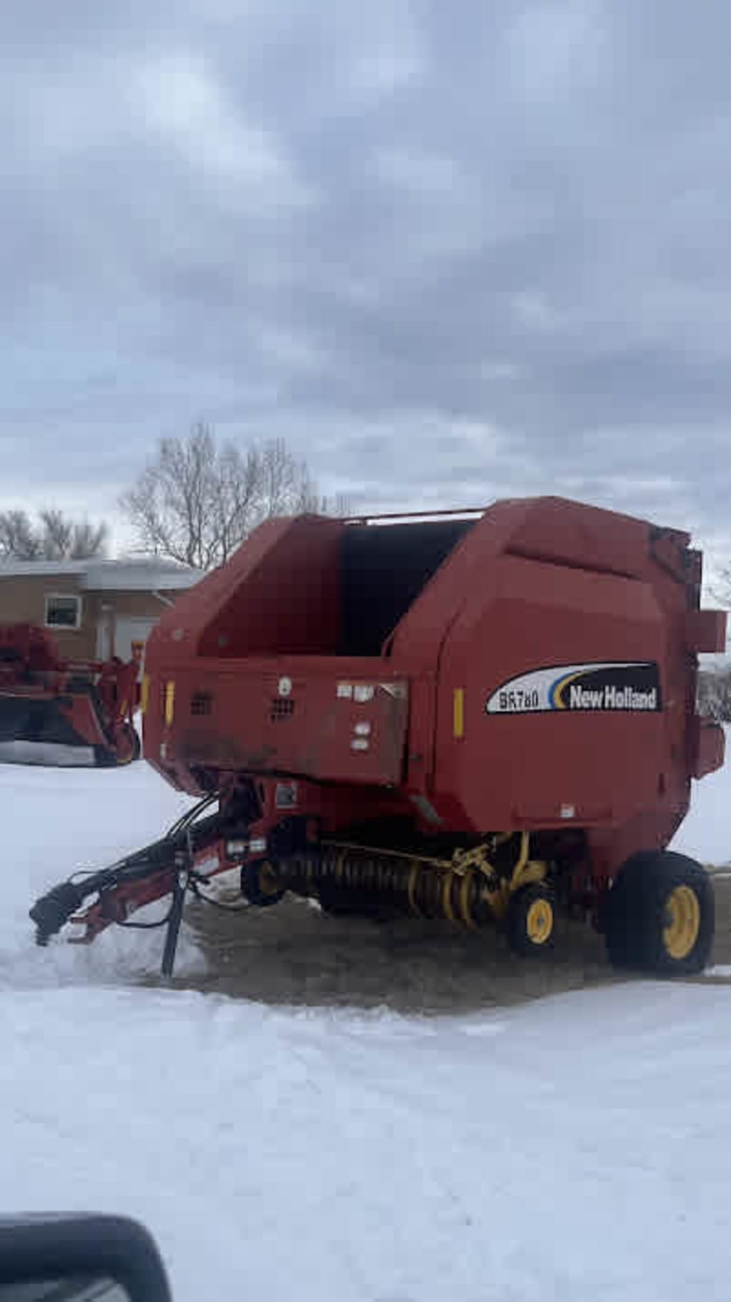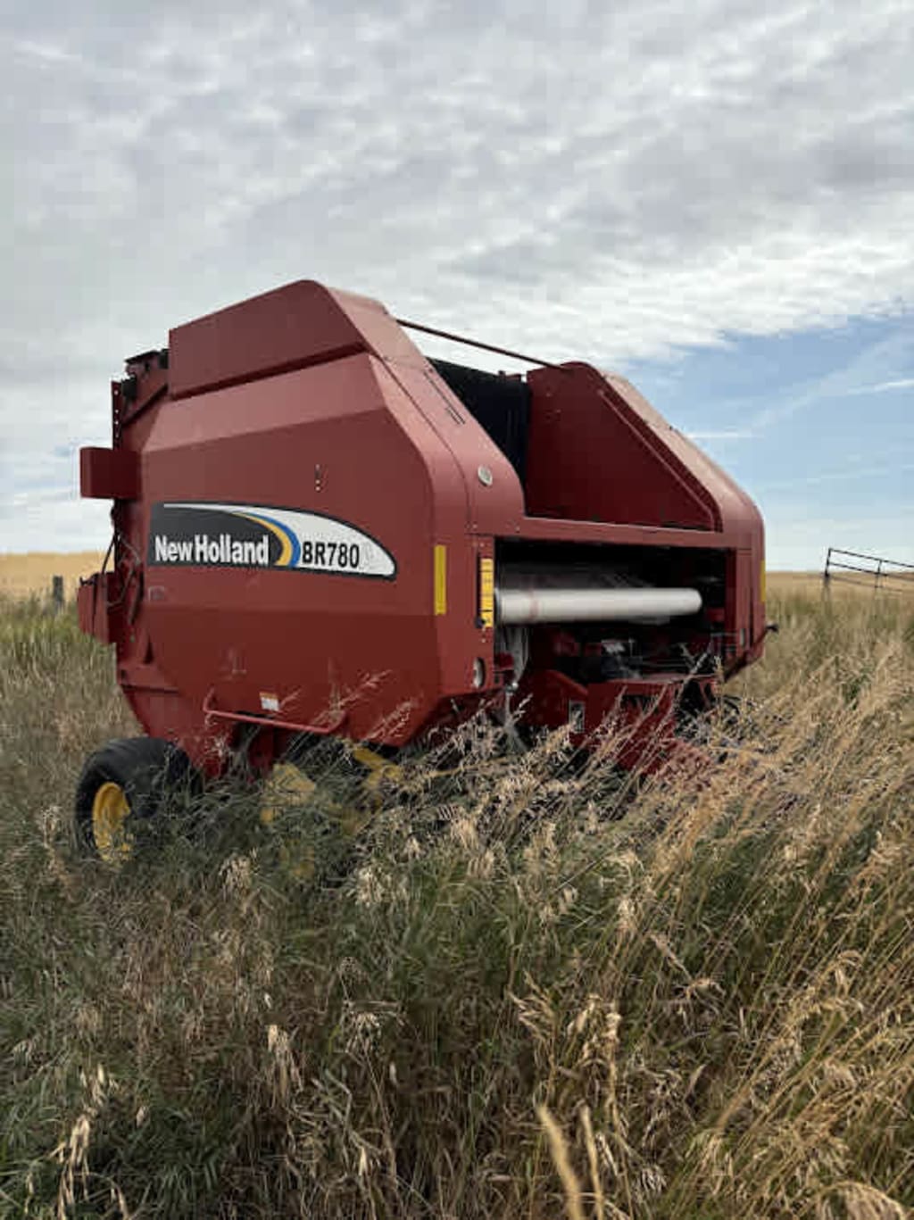 2008 New Holland BR780A Round Baler with 1000 PTO, Endless Belts, Net Wrap/Twine Tie. Features adjustable bale density control, Super Sweep 84-inch pickup, and an integrated monitor. Capable of producing bales up to 6 feet in diameter and 5 feet wide. Approximately 11,000 bales were made.