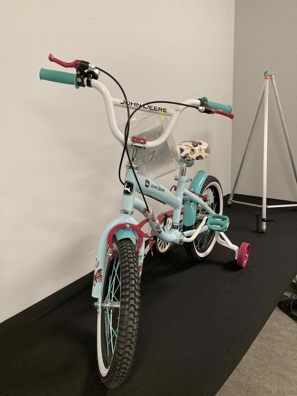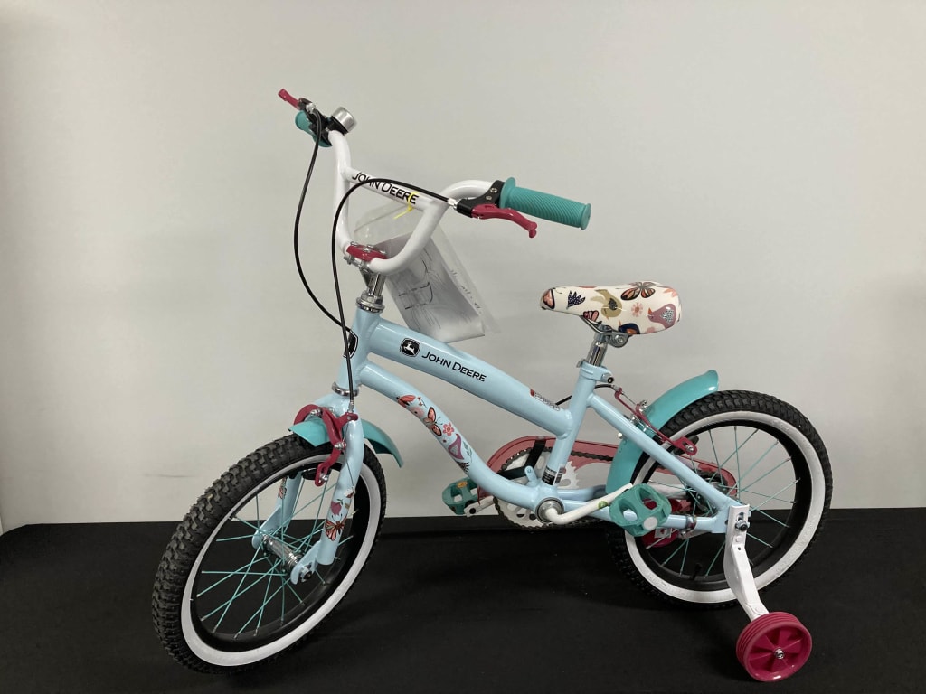 John Deere Girls bicycle with training wheels ; 16" tires. This is one sweet little ride! Thank you so much for the donation!