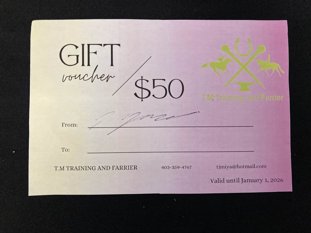 One free farrier service. Tansley is a first time sponsor of our auction. Thank you for your donation. The gift certificate is good for one trimming or can be put towards a shoeing