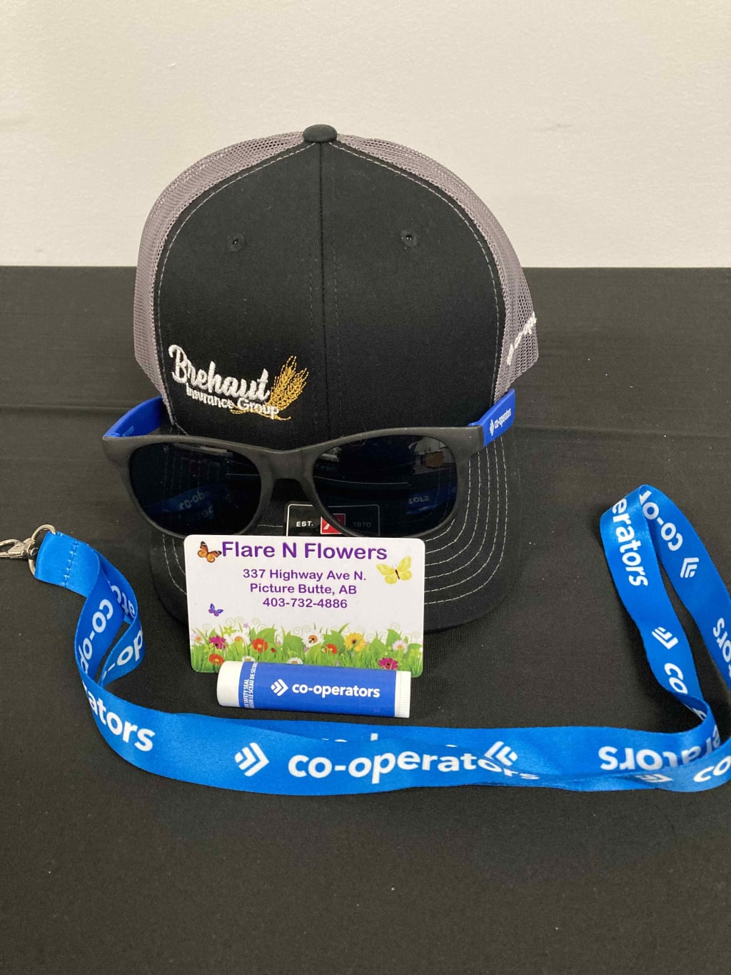 $50.00 gift card to Flare N Flowers in Picture Butte, Ball cap, Sun glasses, Lip balm and a lanyard. Thank you to the staff at the Co-operators in Picture butte for their first time donation!