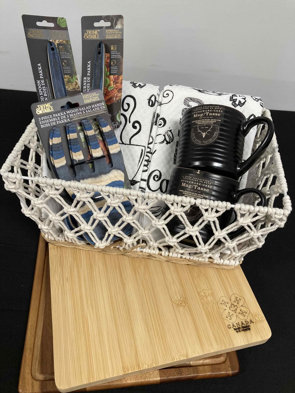 Gift Basket: 2- cutting boards, 2- tea towels, 2- coffee mugs, wooden spoons, salad handles