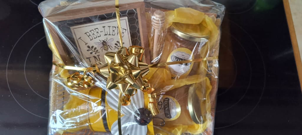 Honey Gift basket: honey stick, cute "Bee-lieve" wall plaque, 2 jars of honey, flower pot. Thank you Marion!