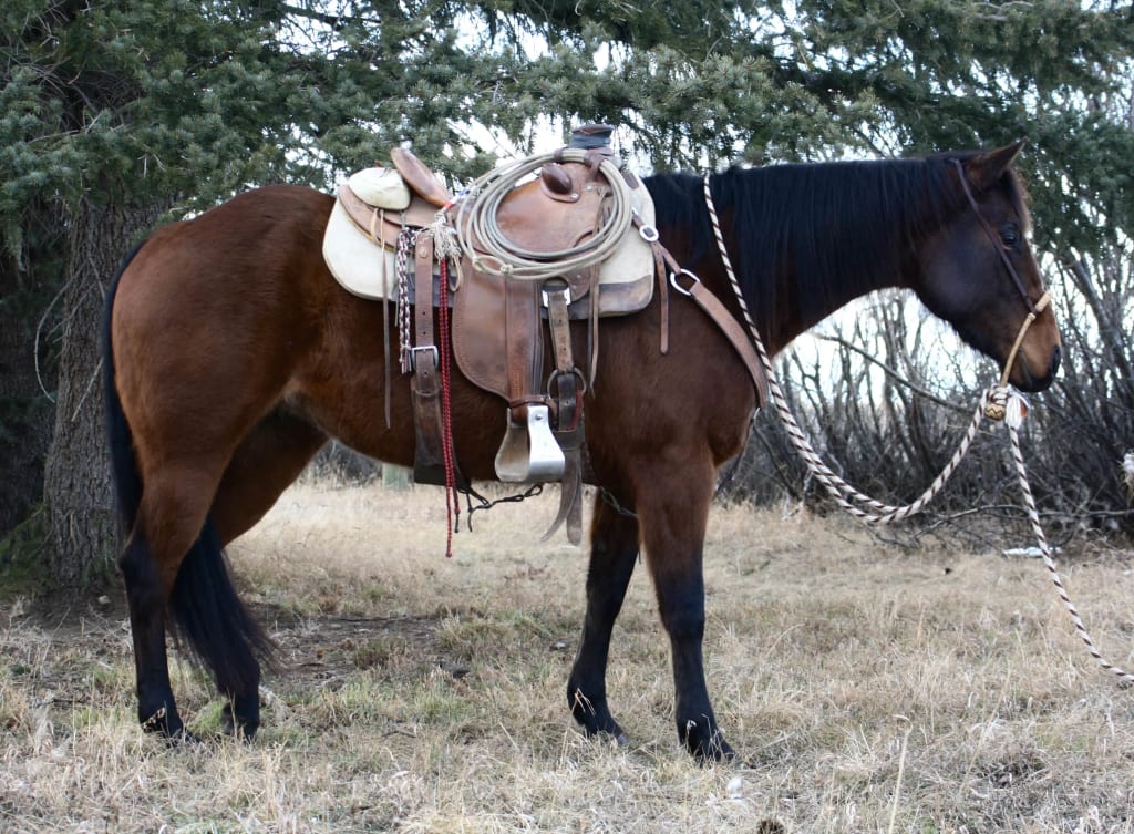 Lilly is a nicely put together mare with a gentle disposition who is ready to be taken in any direction! She is a great ranch/ rope horse prospect and kind enough to be a kids horse one day. In her 45+ days of riding she has been exposed to all sorts of ranch life. She’s been hauled to the arena and followed steers out of the box, ridden through pairs during calving season, drug the calf sled, been harnessed and pulled a light stone boat along with general riding around the ranch. Lilly is good with farm equipment, dogs running under foot and will even side step over to the fence to pick you up for mounting. She’s got a great mind with a lot of try and in no time will be ready to drag calves to the fire for you this branding season!