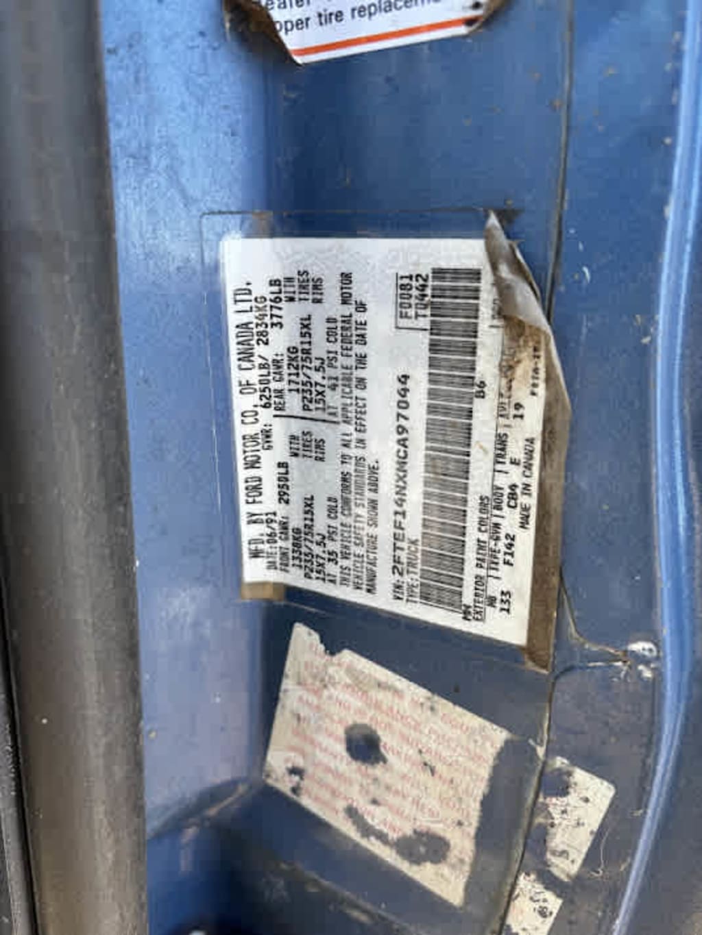 1991 Ford F150, 1/2 Ton Pickup, 50666.1kms at time of listing, Not Running, VIN: 2FTEF14XMCA97044