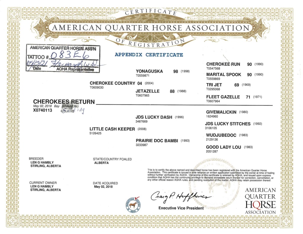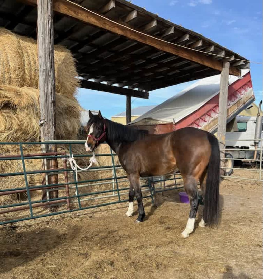Cherokee is 8 years old. As a 3 year old raced Quarter Horse Races in 2021 and 2022. Racing history: one 2nd and 2 3rds. Home with a chip on front knee. X-rays done on March 12, 2025, available on request. Vet checked by Todd Baker Fort Macleod Vet Clinic. Sound now ready to race and ride.
