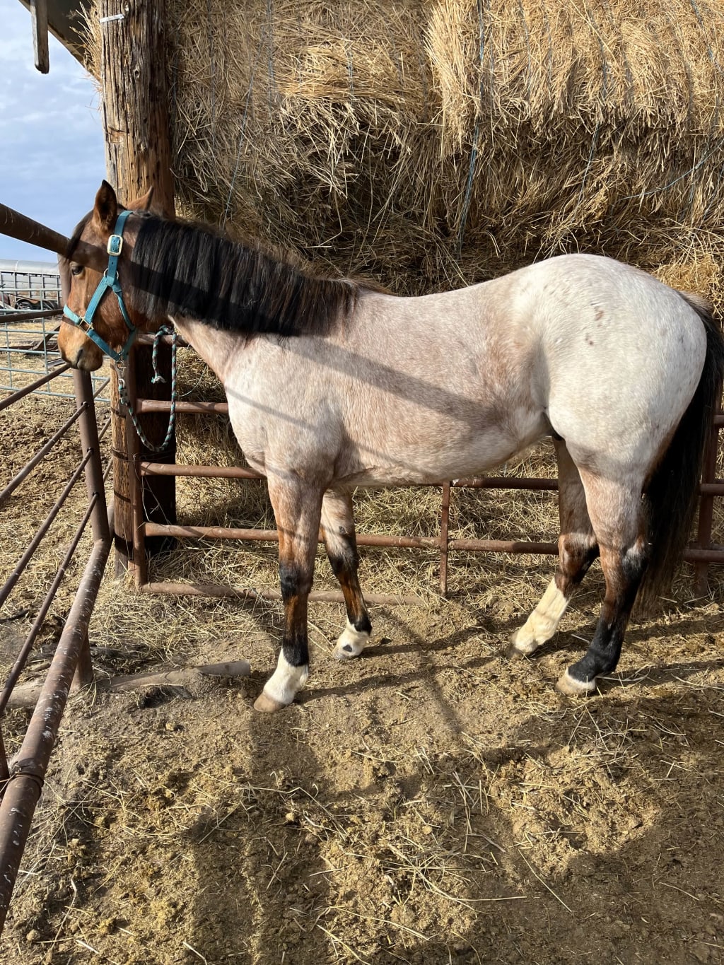 Barn name Roni 2 year old. He was in a pasture with 3 other horses and a pony. Likes people. Handles nice and trims good. Loads easy.