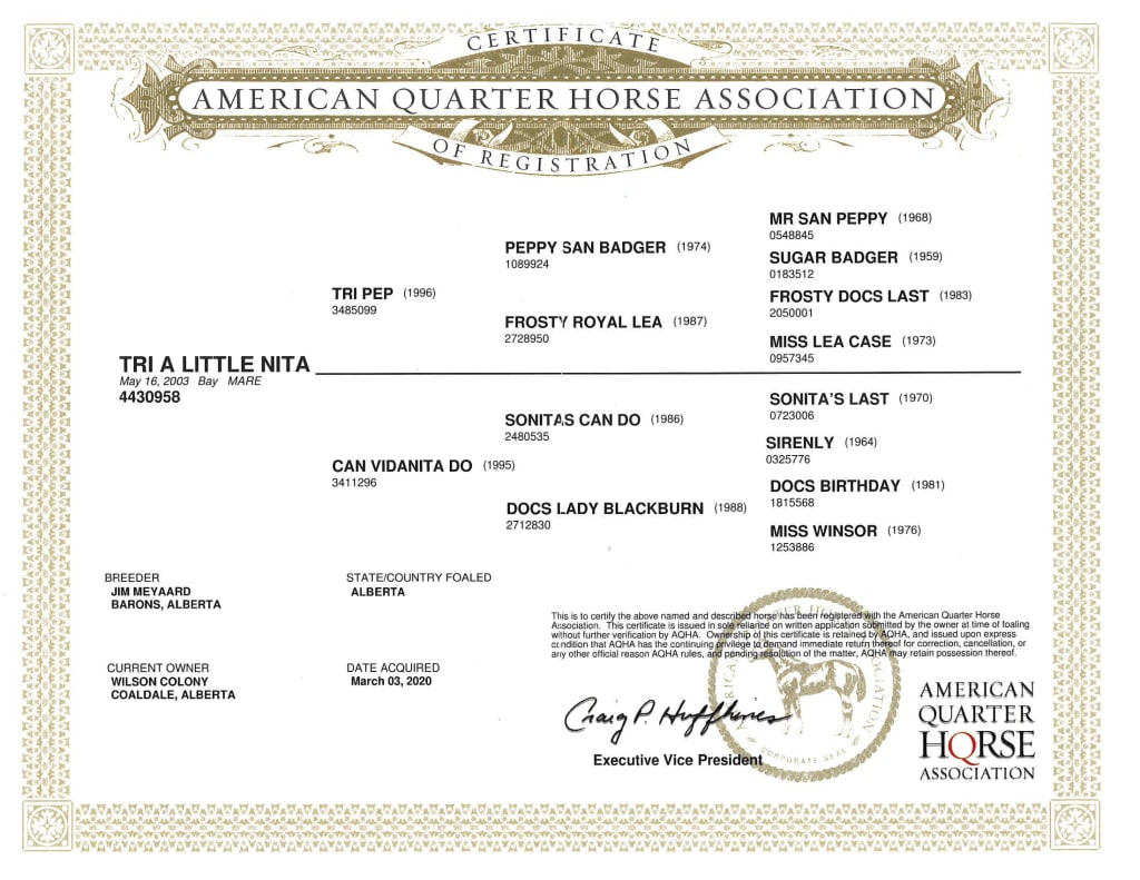Broodmare due in may well bred mare, Peppy San Badger on top, Sonitas Last on bottom. Bred to California Chrome which goes back to Peptoboonsmal, top Docs Birthday on bottom. Live foal guaranteed.