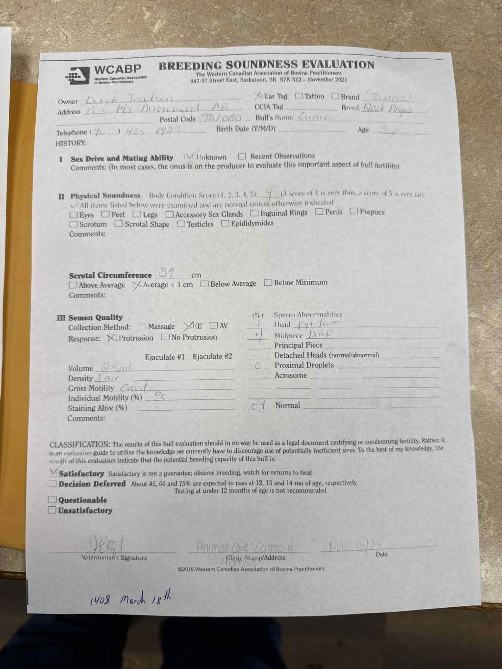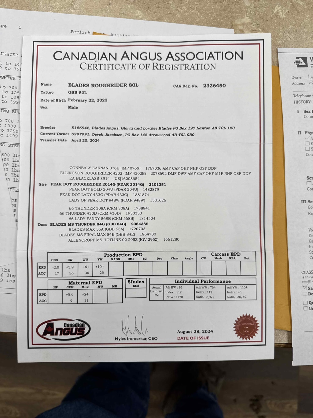 DEREK JACOBSEN 1 Blk Angus Bull, papered, sells commercial. Name: Blades Roughrider 80L DOB: Feb 22/23 BW: 92lbs SC: 39cm Mobility 80%