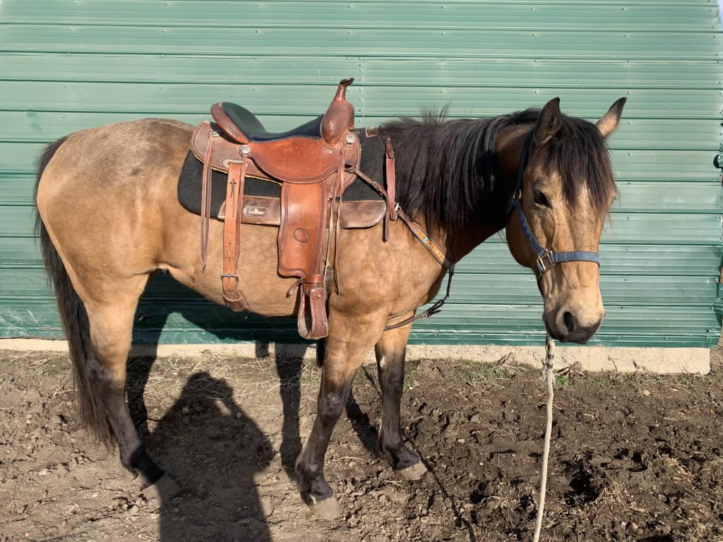 Hawk is a 16 year old buckskin gelding. Great with farrier, loads and hauls great. Well broke and has all the buttons. Used in the mountains as a pack horse, good for trail riding. Has been used as mounted shooting horse. Used to sort and gather cattle but not a rope horse. No maintenance issues.