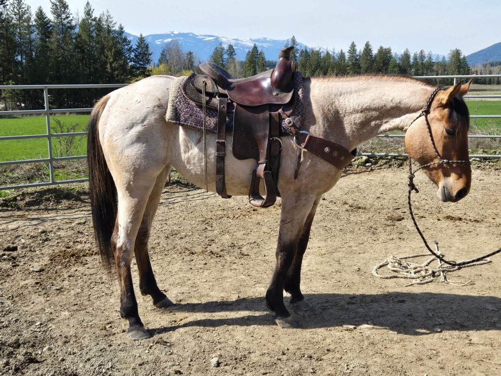Shasta is a coming 3 year old buckskin roan filly. Doing well under saddle. Rode through water, past cards, motorcycles, peddle bikes and dogs. Around 14.3hh. Has lots of potential.