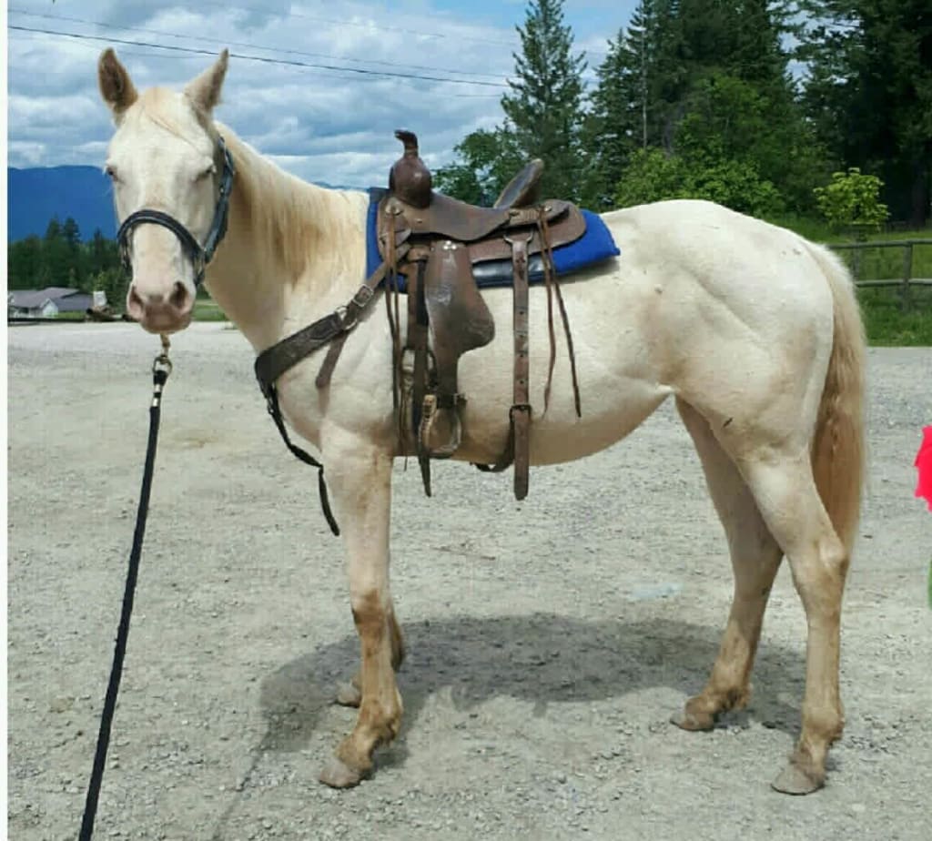 Frost is a coming 3 year old cremello filly doing well under saddle. Rode through water, past cars, motorcycles, dogs. Will make a good trail horse.