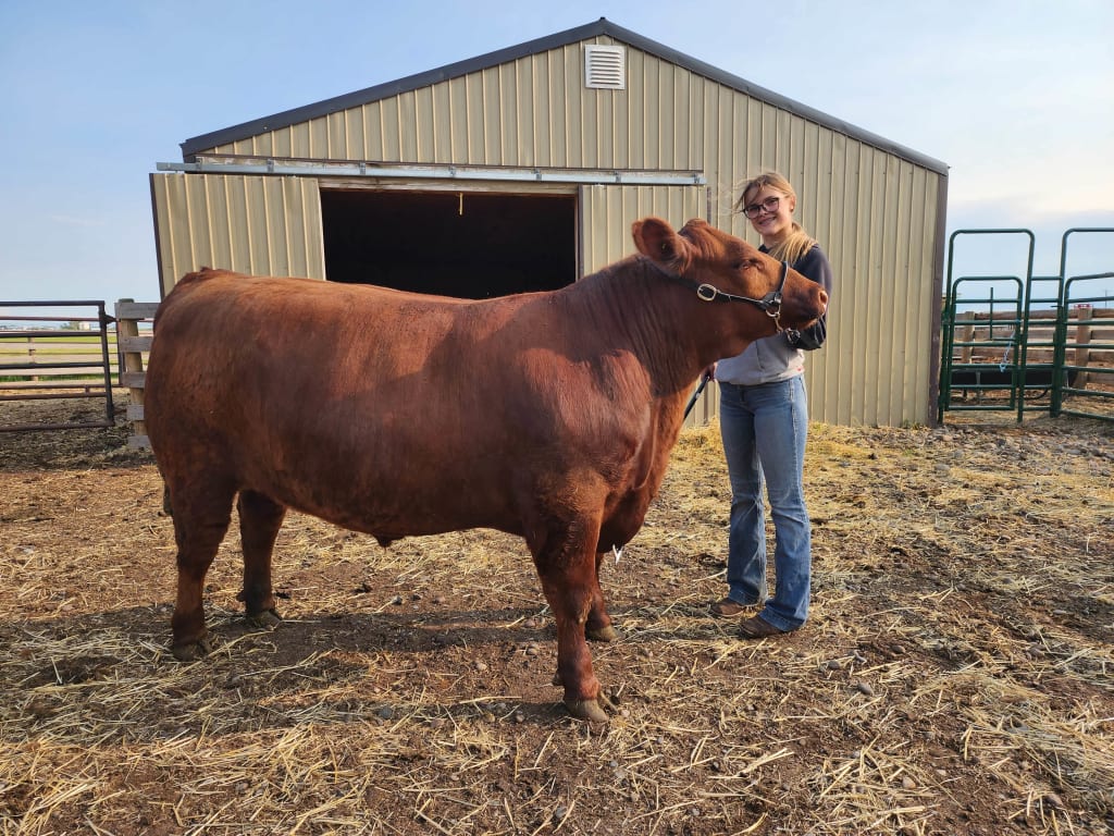 My name is Ainsley Schweitzer. This is my 8th year in 4-H. This year I am showing five projects a market beef, market Lamb, prospect ewe and a yearling ewe with her lamb, but unfortunately my Heifer died. My other hobbies/sports outside of 4-H are basketball, track and field, Alberta High School Rodeo, surfing and snowboarding. My steer is a Red Angus his name is NLE Choppa/Bellaroo. He's treated me well for the most part and and he's obviously been eating quite well too. I will be sad to watch him go but I am excited for the show.